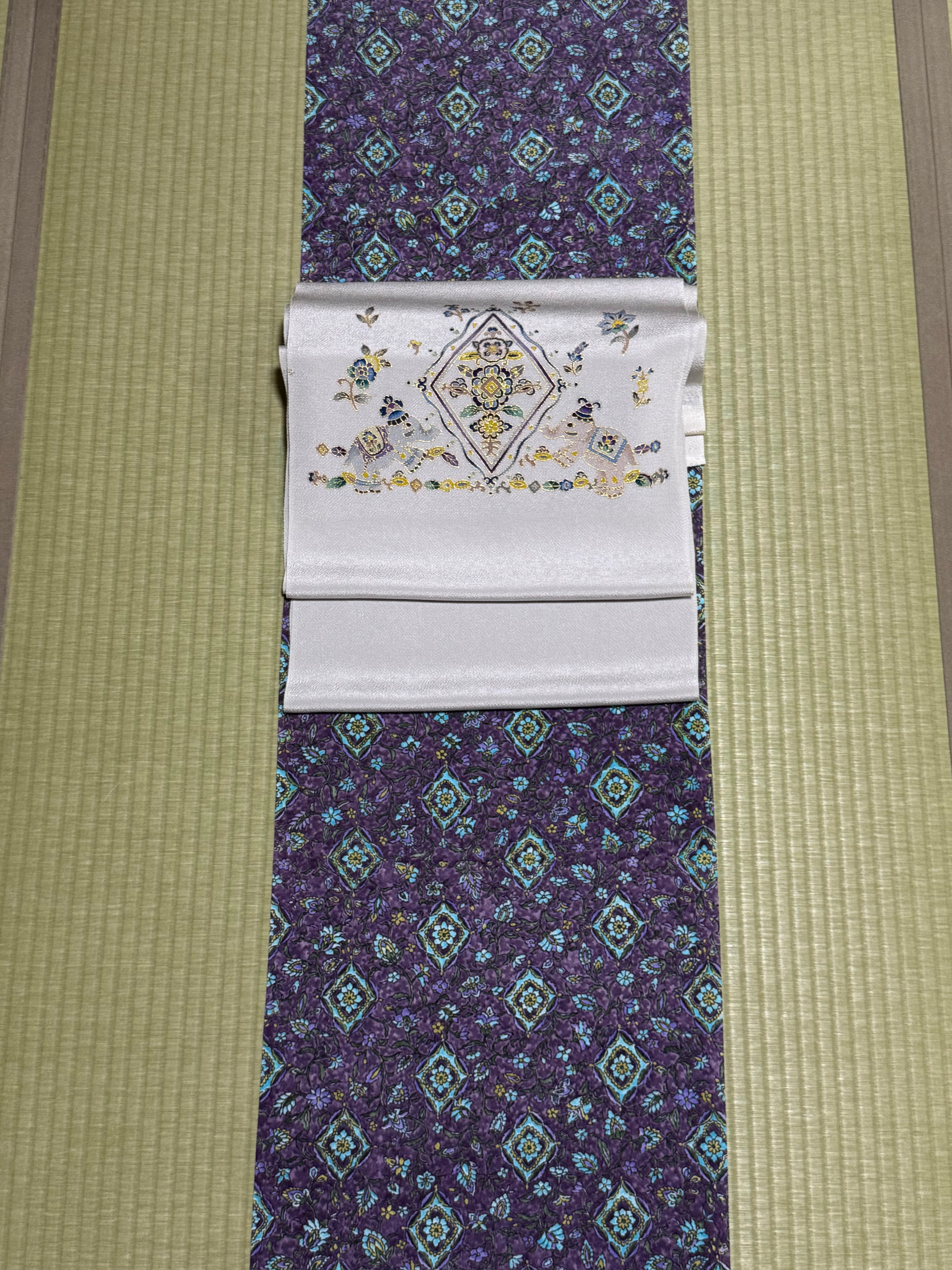 深みのある紫地に、ターコイズブルーや若草色、淡い黄色を配した更紗調の文様は、華やかさと落ち着きを併せ持ち、年代を問わず着用いただけます。