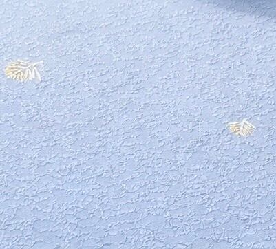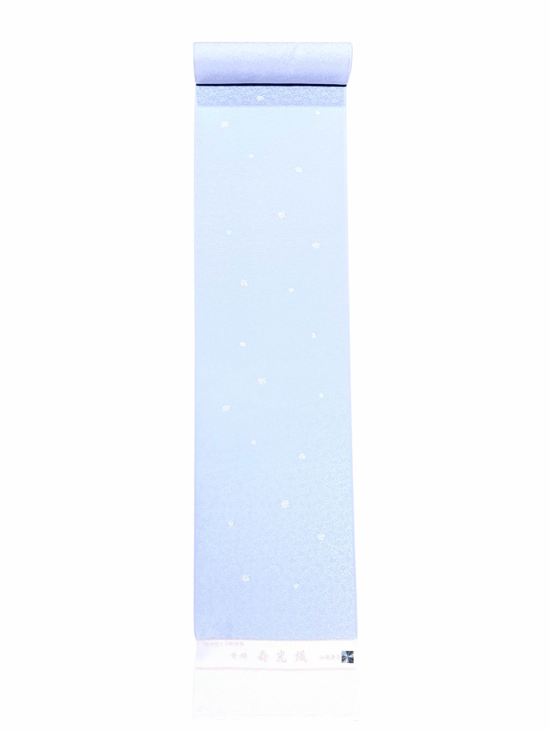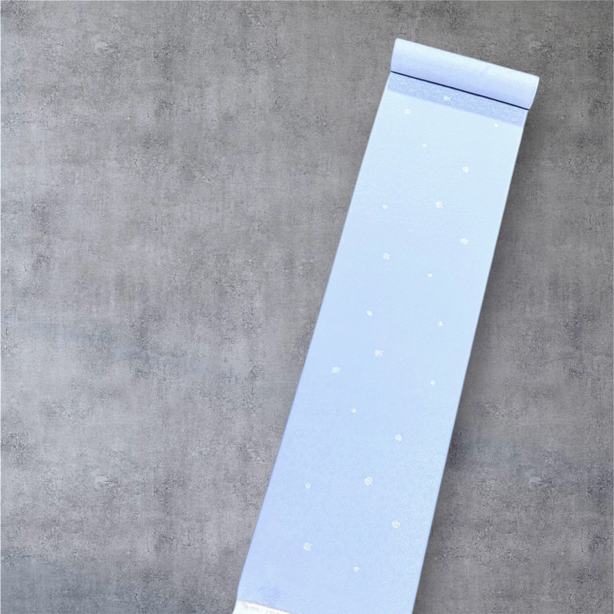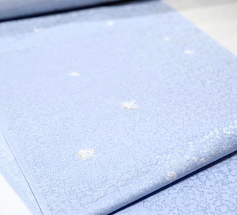 やわらかな淡水色の地に、繊細な小華唐草文様が控えめに散らされ、
