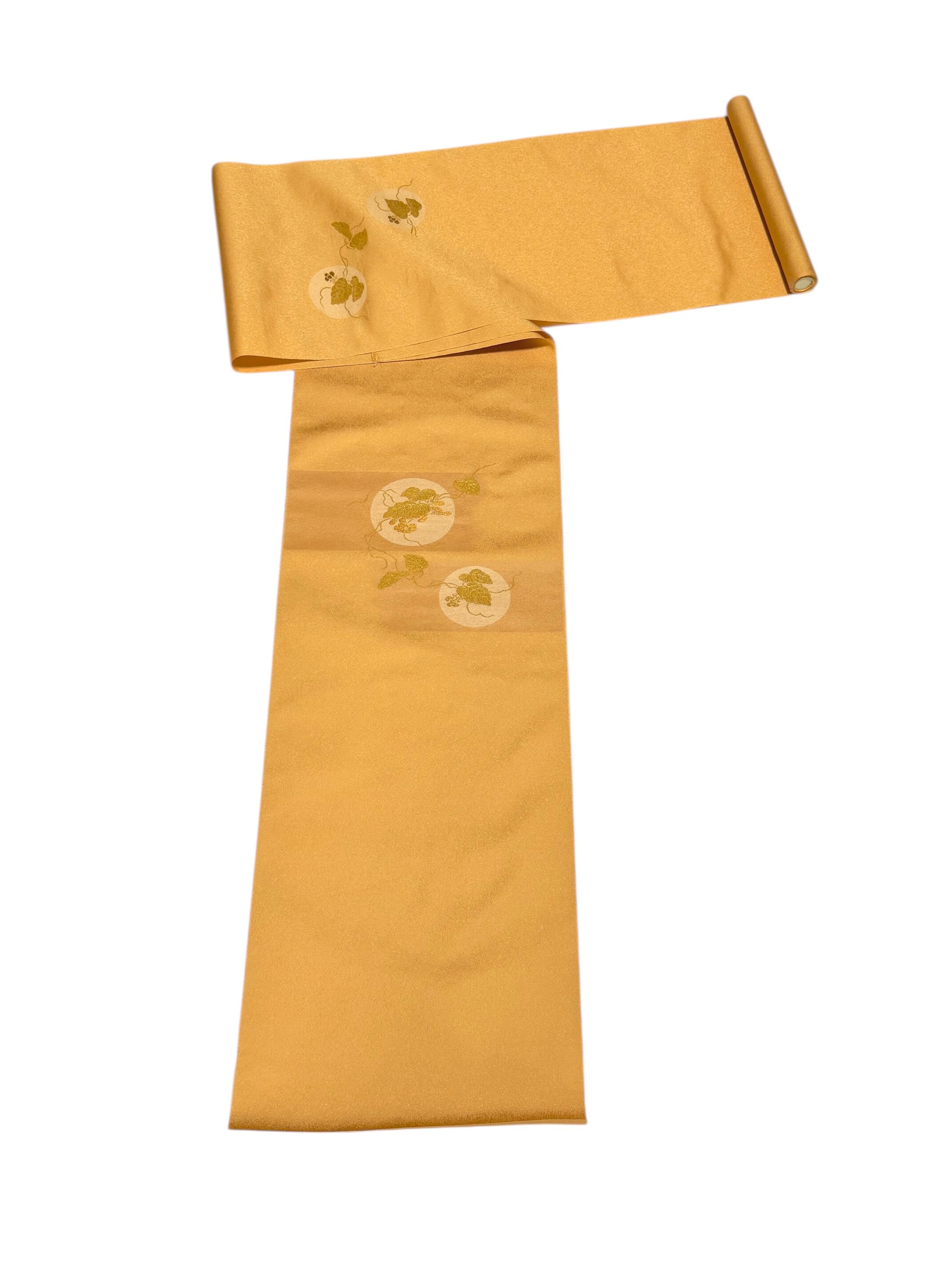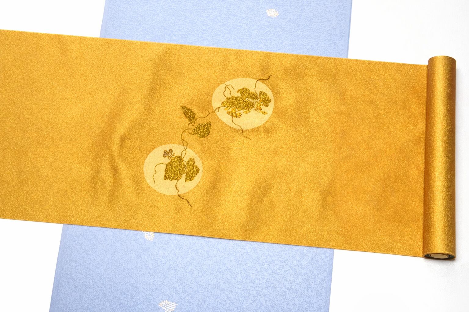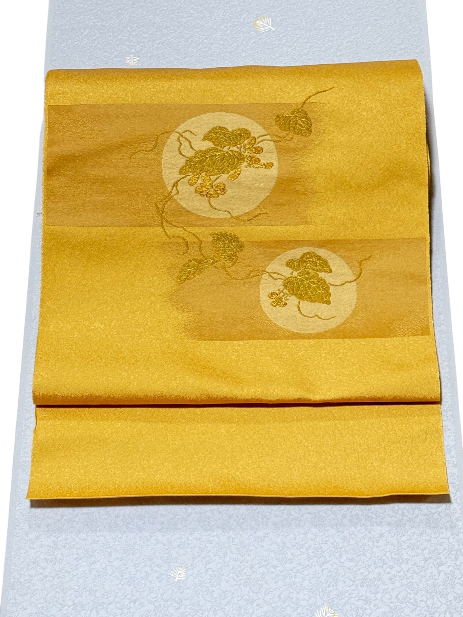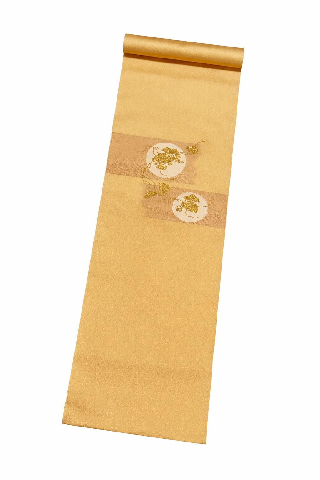 やわらかな黄金色の地に、月のように浮かぶ円文と、蔦や秋草を思わせる優雅な花意匠を配した、気品あふれる名古屋帯です。
