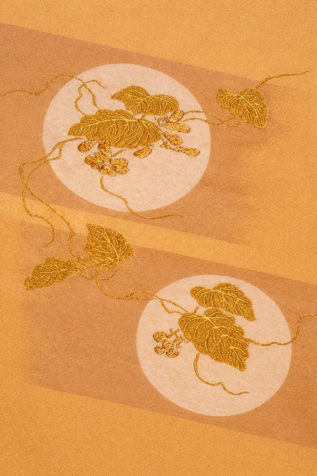 落ち着いた金茶系の色合いは、訪問着・付下げ・色無地・小紋まで幅広く合わせやすく、