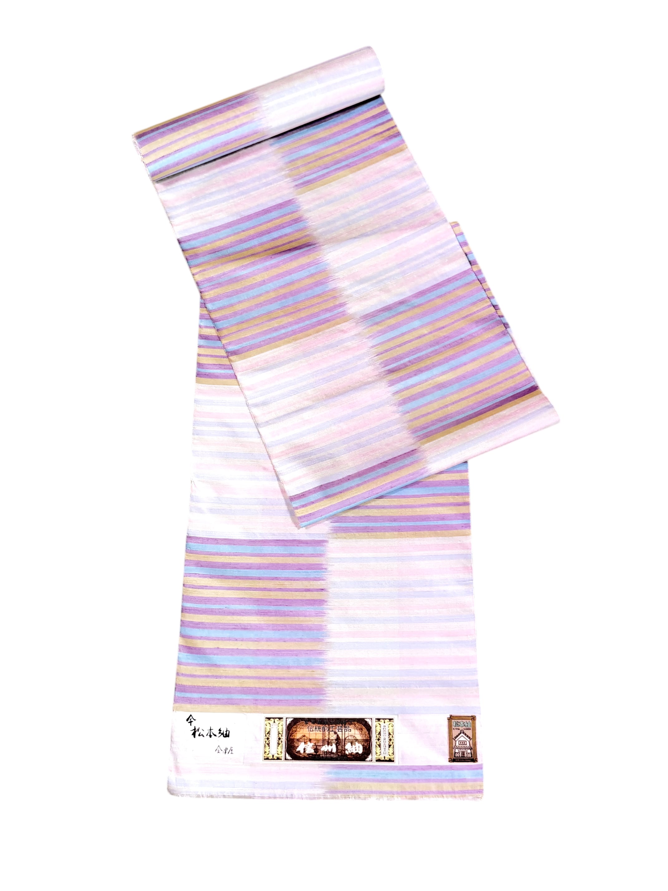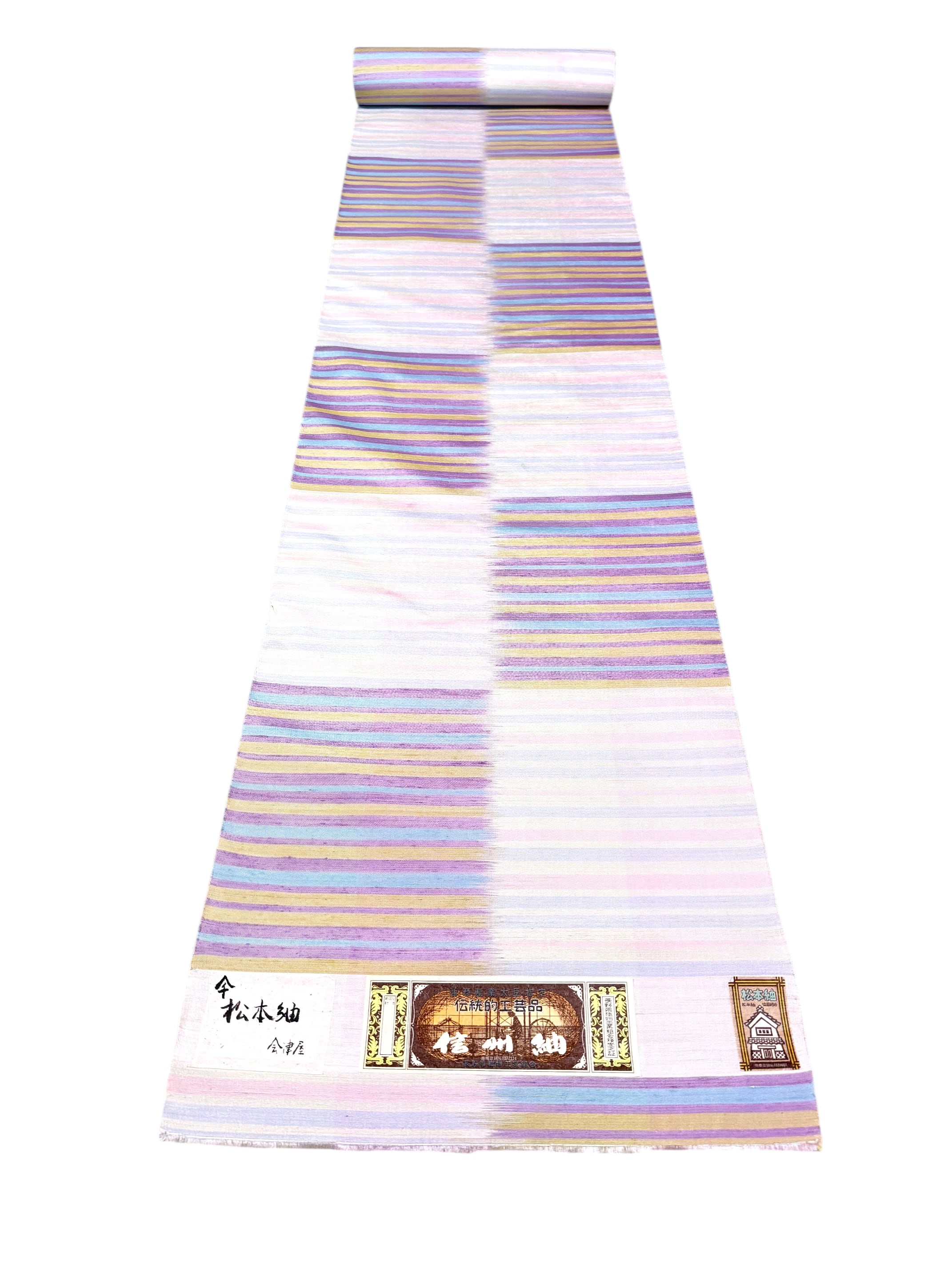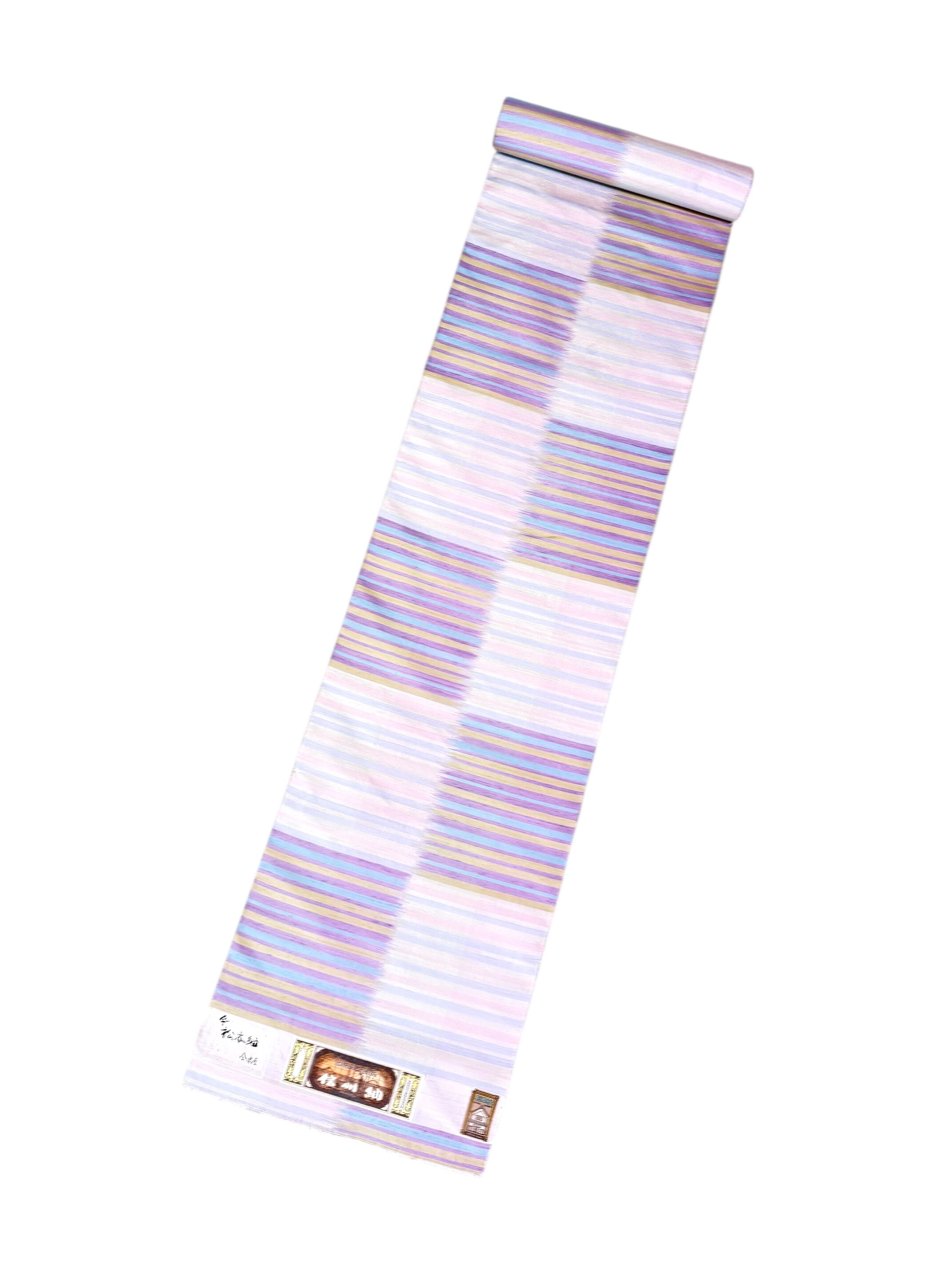 こちらは老舗・会津屋による一反で、淡く溶け合う多色の縞が、織りならではの奥行きと優しい表情を生み出しています。