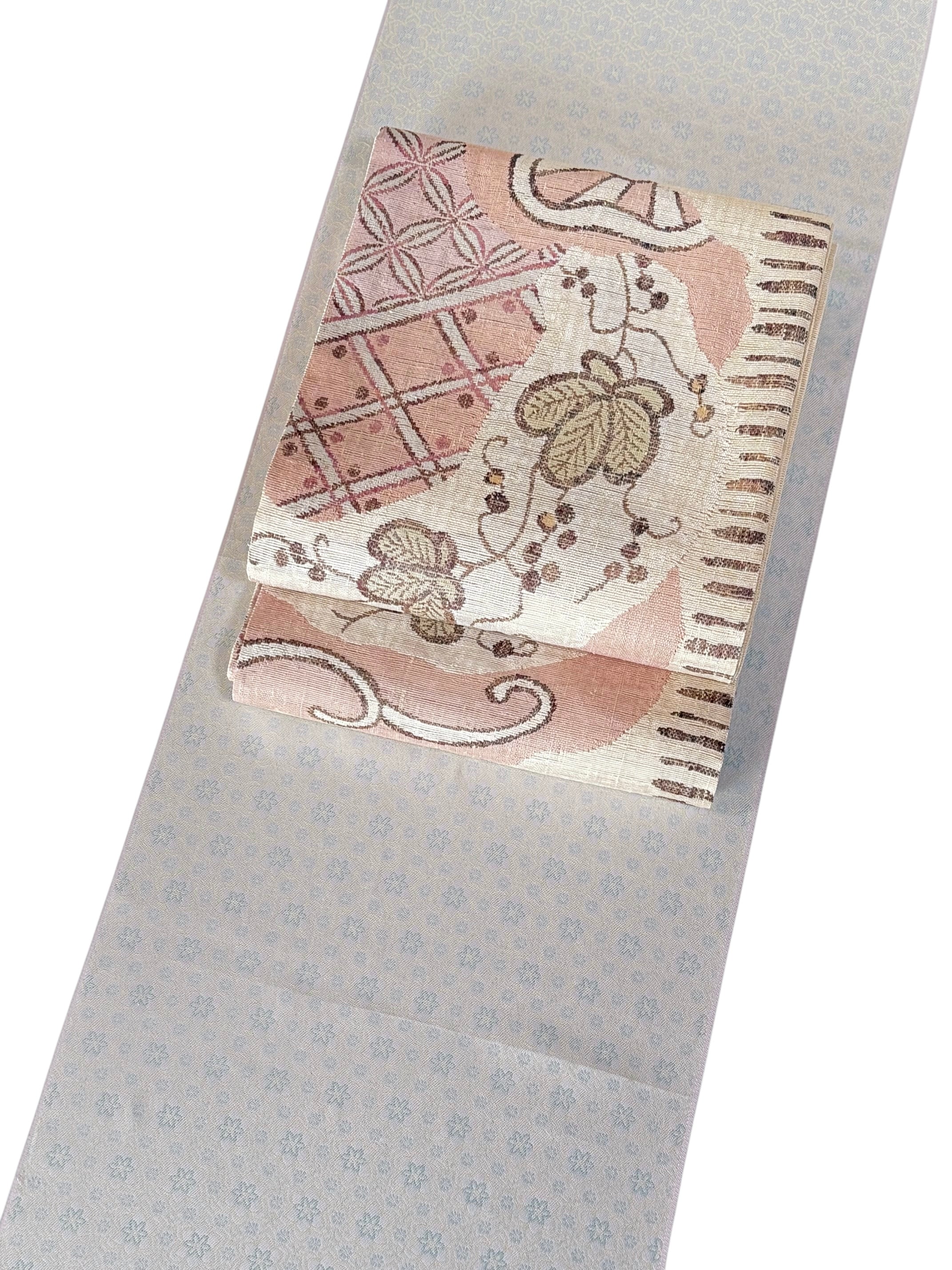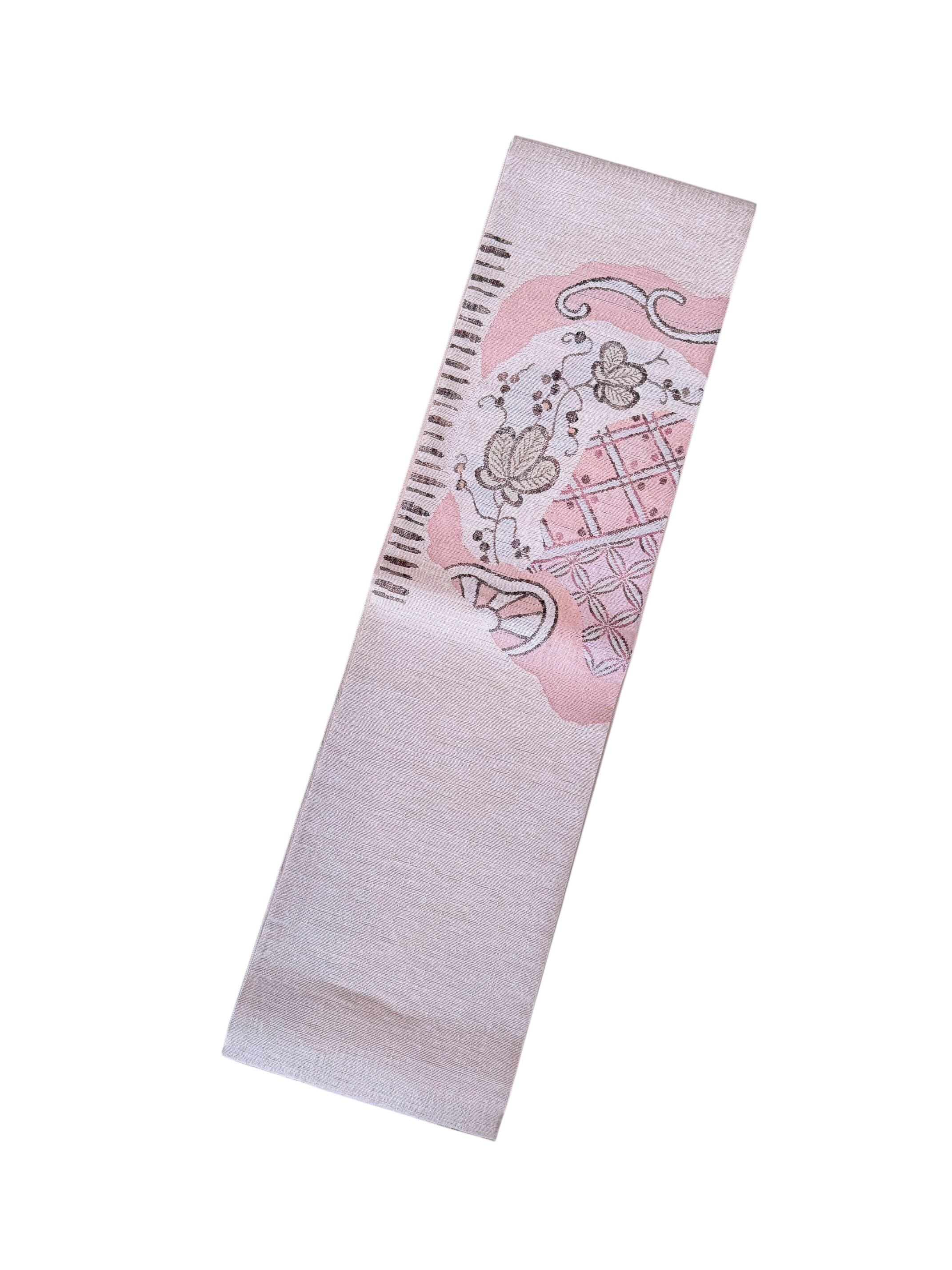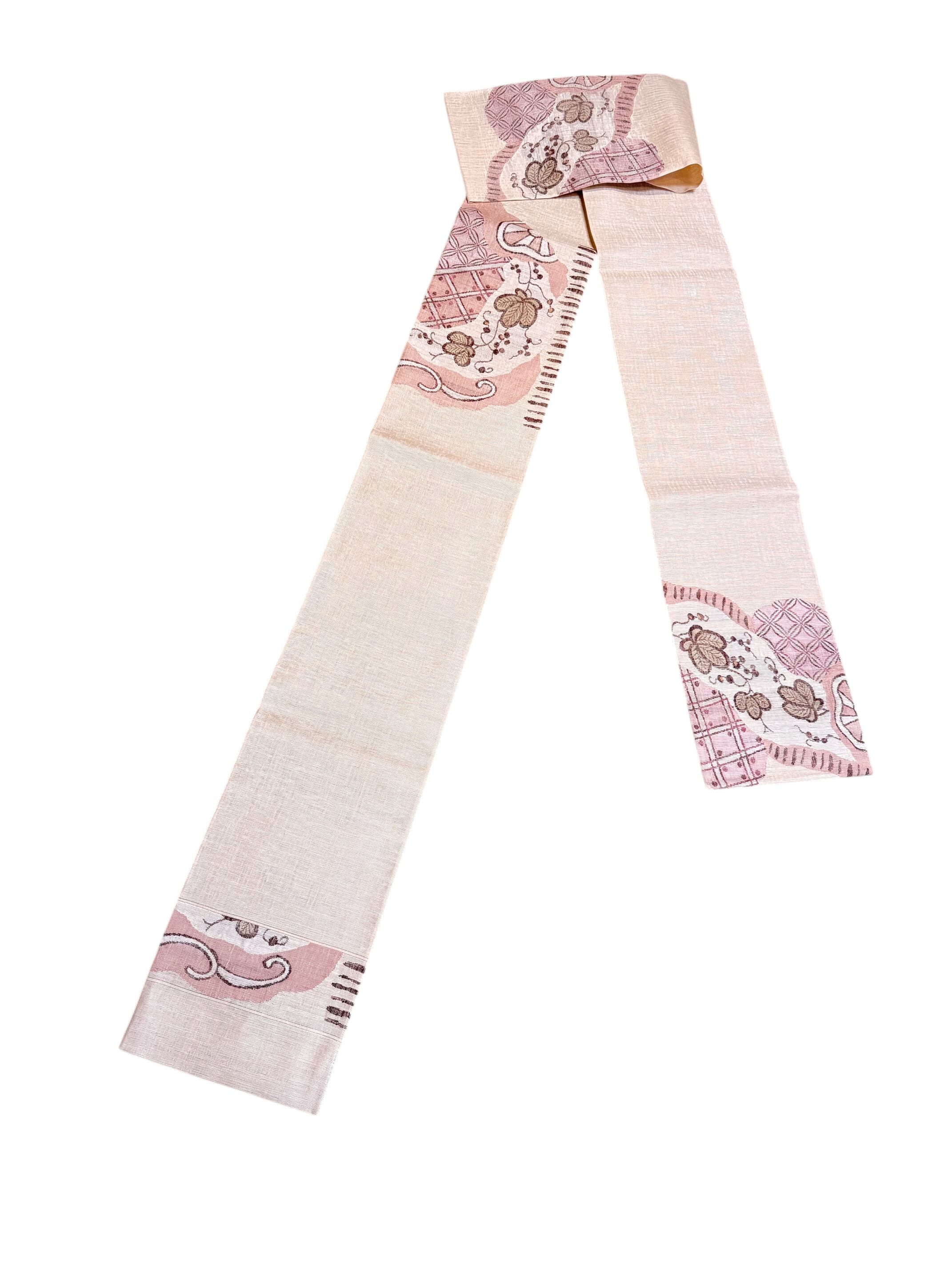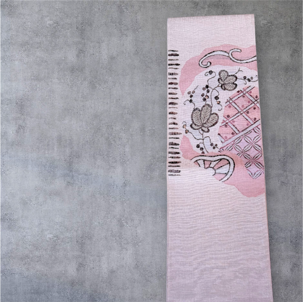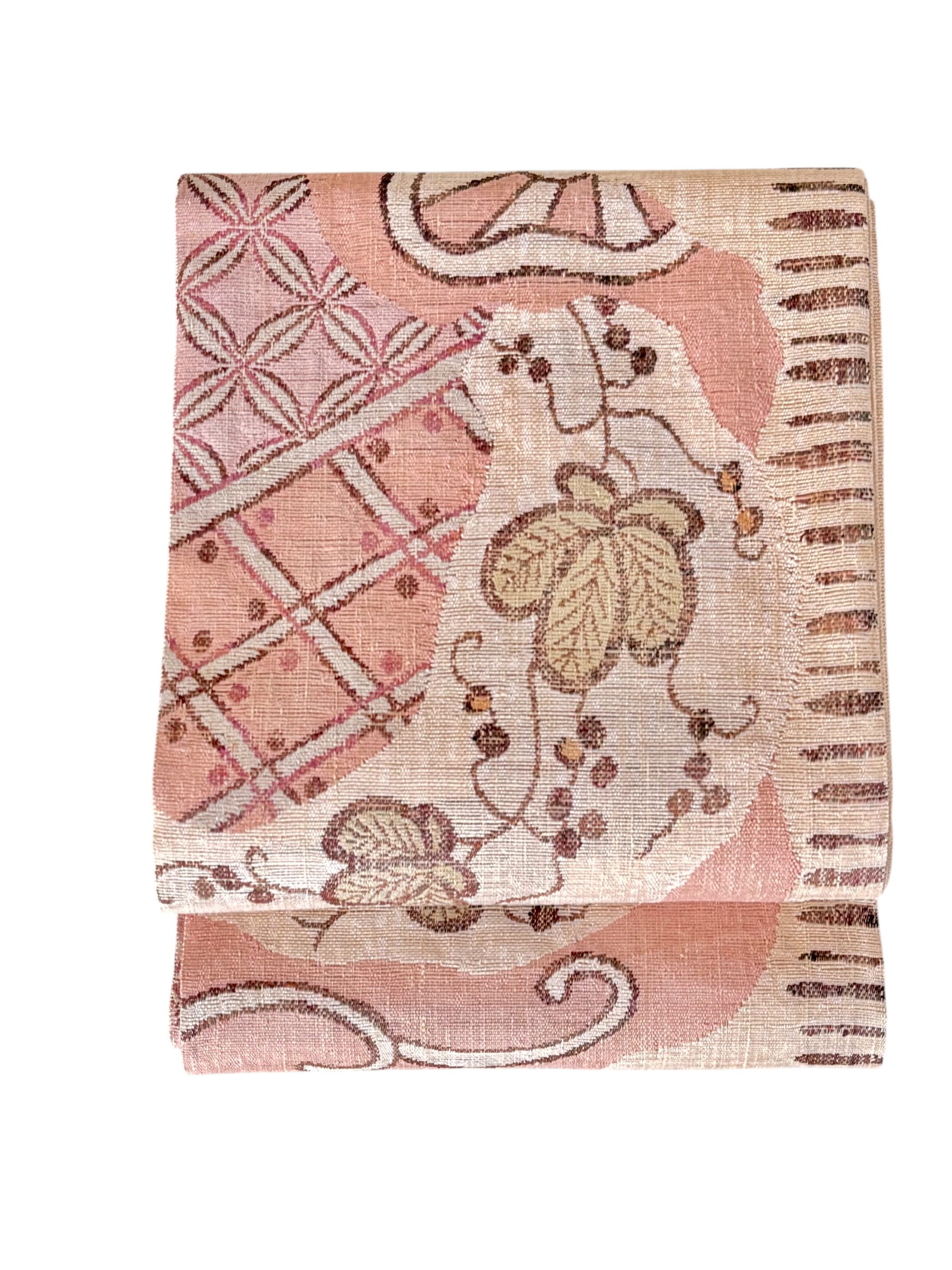 やわらかなピンクの地に、異国趣味を感じる更紗調の花唐草と幾何柄をミックス。